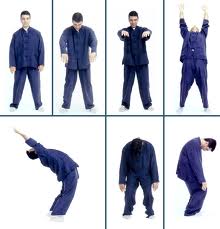 Después se expira por la boca mientras se relajan gradualmente las rodillas y las regiones: lumbar, dorsal y cervical, la cabeza y los brazos se dejan colgar libremente.