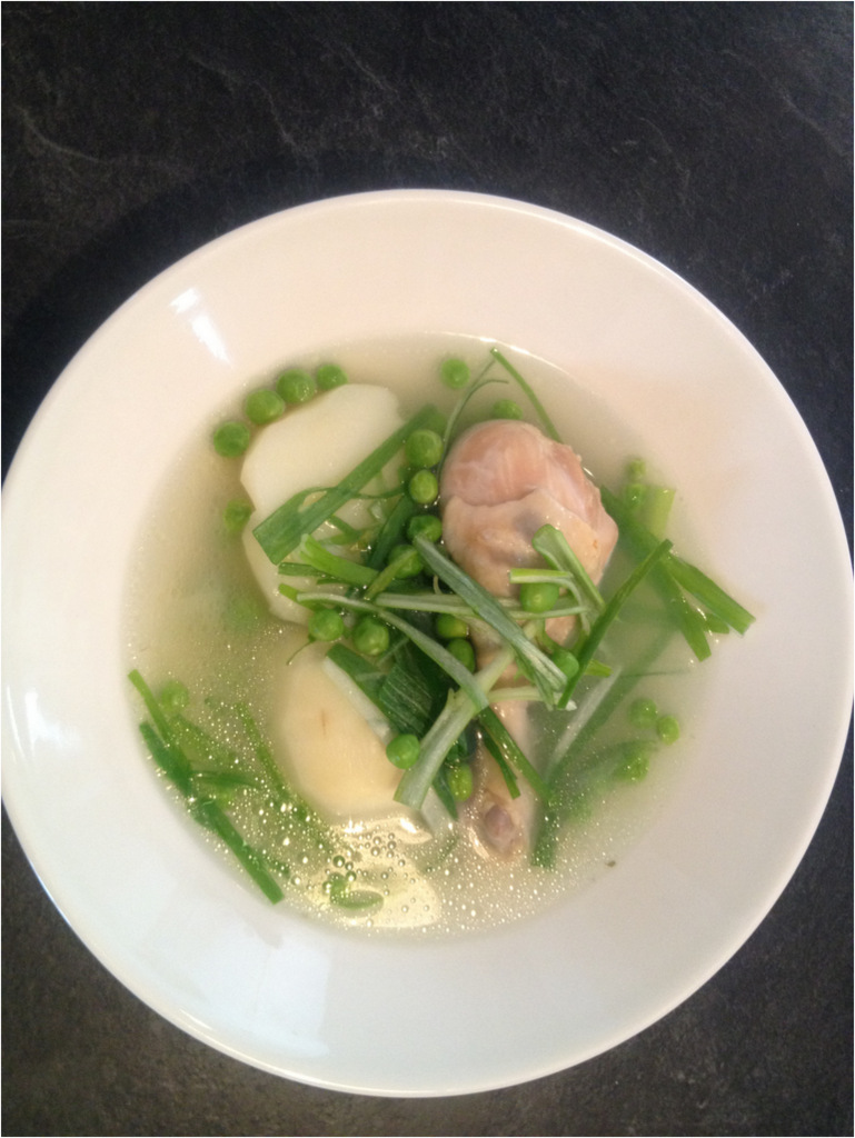4º— Diez minutos antes de servir, poner la cebolla verde encima de todos los ingredientes, solamente para marchitarse. Escurrir el caldo con todo cuidado sin mezclar, poner en una fuente y cubrir con uchú llaj-wa.