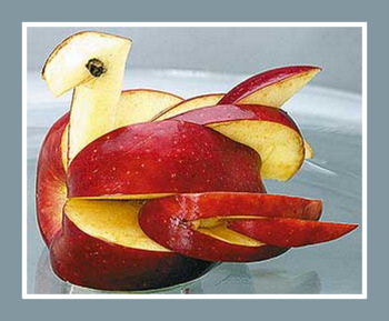 El esculpido (o tallado) de la verdura y de la fruta es una técnica oriental a la que se denomina Mukimono. Este arte de esculpir vegetales recuerda al del ikebana (el famoso arte floral japonés) ya que las verduras adoptan formas de flores. El esculpido se realiza con cuchillos muy delgados y de gran precisión para conseguir una gran finura. El arte en el manejo de estos cuchillos es a lo que se denomina kaishiki. Además de representar flores, también se tallan hojas, paisajes, animales e incluso mensajes en ideogramas. La manera de cortar varía según la textura de la verdura o fruta, y algunas verduras se presentan al corte en tiras circulares, otras a dibujos geométricos (círculos, medias lunas, rosetones, etc) y otras a cintas. El objetivo de esta técnica no es solamente destacar las formas y los colores, sino también poner de relieve los aromas y los sabores. No puedo contarte más sobre el tema ni facilitarte fotos ya que en internet no existen tales con una buena resolución. Yo te aconsejaría que ojearas en librerías o blibliotecas libros sobre el tema.