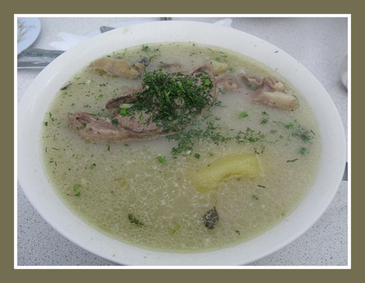 Ponemos en la olla con el agua fría, el costillar de cordero, el hueso blanco cortado en trozos (bien lavado) y las verduras picadas en tiras largas, el perejil y sal; dejamos hervir por varias horas hasta que el caldo quede prácticamente lechoso. Luego colamos este caldo para evitar que queden huesos pequeños.