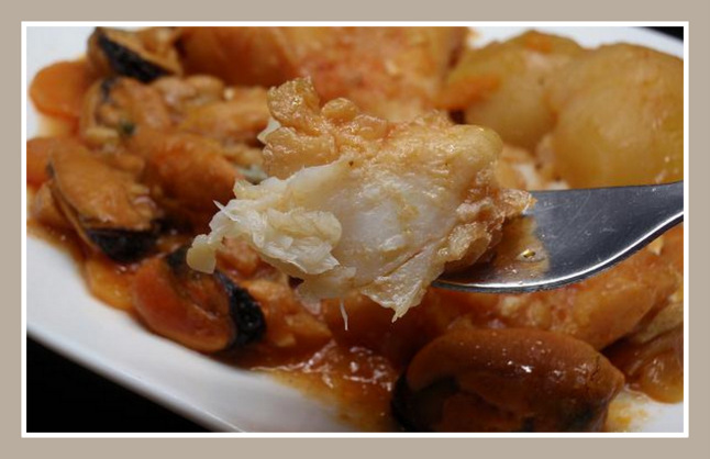 Se puede servir con papas blancas cocidas aparte o poner éstas al bacalao, crudas, partidas en cuatro, veinte minutos antes de servir.