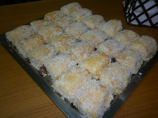 Sacar del horno y dejar orear, barnizar con almíbar y espolvorear con coco rallado o decorar con crema pastelera.