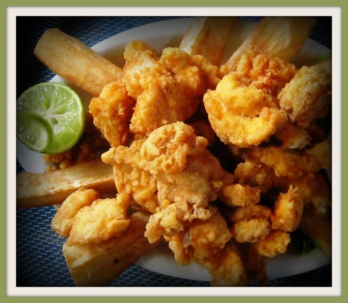 Servir el pescado sobre la lechuga, las yucas fritas y una ensalada de tomate y cebolla