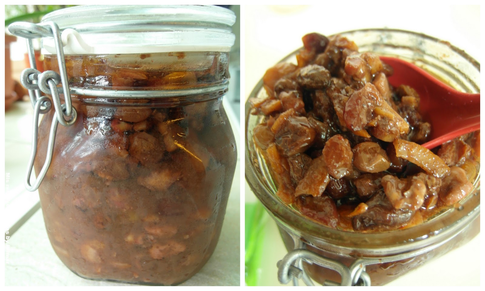 10. Desde ese momento y hasta el día que se consuma, se le rocía o pincela vino o ron, o si ha quedado un poco del líquido de la maceración, para que se mantenga suave y aromática. (Yo he rociado mi licor casero de cereza).