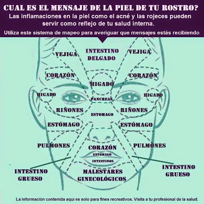 Frente: Vejiga, intestino delgado, intestino grueso. Por lo general, las líneas en la frente reflejan un desequilibrio. La congestión o el acné en esta área representa congestión en el S. digestivo y posiblemente que existe poca desintoxicación. La piel roja y seca o escamosa es un indicio de la falta de líquidos en el tracto digestivo.