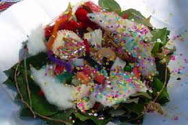 Después que las brasas se han consumido y extinguido el fuego, vuelven a la casa y en señal de contento derraman en el suelo confites y flores.