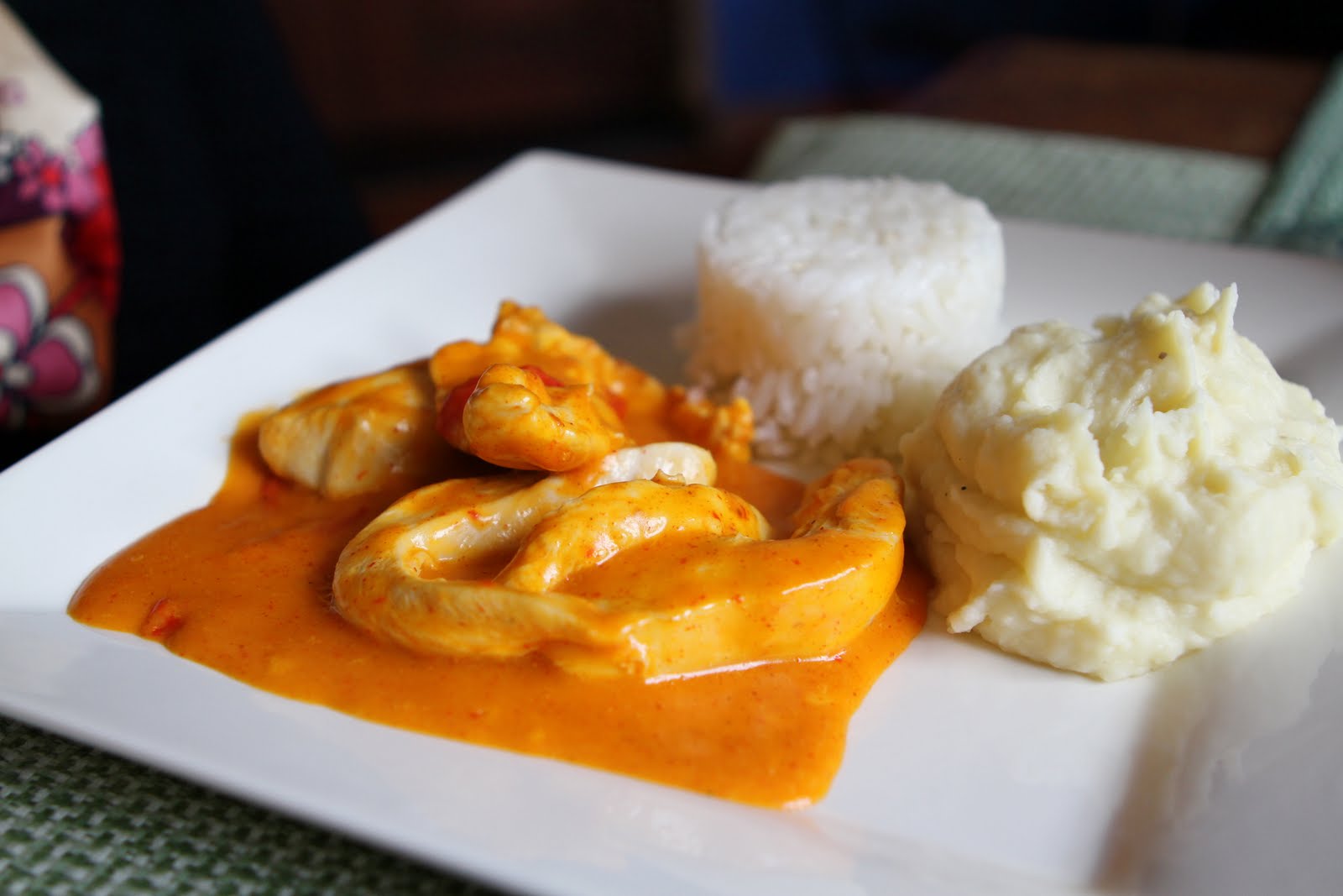 Ana Carola gets the Moqueca ($7 USD), which is a dish influenced by the Bahia region of Brazil where the cooking is very much derived from Africa. Moqueca Bahiana is basically a stew with vegetables, spices, with coconut milk and dendé oil (palm oil). The meat of choice here is chicken. To me, it seems more derivative of Thai cuisine than African – at least from the look and smell. The potatoes are mashed here.