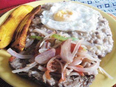 Remoja el frejol una noche antes para que ablande, lávalo bien y escúrrelo muy bien para ponerlo luego en una olla a presión. Llévalo a fuego fuerte y cuélalo, reservando el caldo, pues lo usarás después para cocinar el arroz, agregando un poco de aceite y sal a gusto. Deja que el frejol seque un poco y coloca el queso rallado, bate un poco con una cuchara de palo y saca la olla del fuego. Pica la carne en trozos medianos para asarla en aceite caliente, no sin antes sazonarla con sal, comino, pimienta y ajo. Una vez sazonada, déjala cocer, tapando la sartén para que salga todo su jugo. Paralelamente, pica la cebolla en julianas para hacer una chorrellana y agrega un poco de tomate y pimentón. Fríe los plátanos en tiras largas y, en otra sartén, los huevos. Para servir coloca el maneadito a un lado del plato con el huevo encima. Pon el asado con un poco de chorrellana encima al otro lado y termina de decorar con los plátanos fritos a un costado.