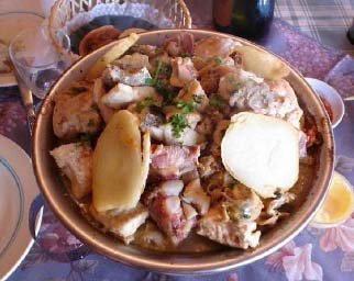 Es un cocimiento de mariscos, carnes de cerdo, vacuno y pollo, panes de papa