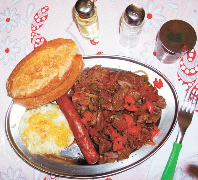 Paralelamente, en otra sartén, fríe el huevo y luego la salchicha hasta que quede bien dorada. Acompaña con una marraqueta crocante y café.