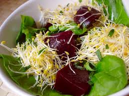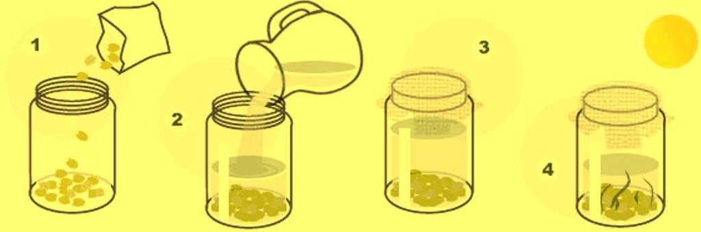 Elaboración: El primer paso es colocar las semillas. (1) Pon dos o tres capas de granos previamente lavados en el fondo del bote de vidrio, en relación a su anchura. (2) Cubre con agua. Añade agua no demasiado fría, como mínimo en una cantidad tres veces superior al volumen de granos. (3) Tapa el bote con gasa para hacer vendajes y una goma elástica. Escurre y riega tres veces al día. (4) Ha llegado el momento de cosechar. A los pocos días ya tendrás los brotes. Si los quieres con clorofila, el último día expónlos a luz indirecta. Experimenta con semillas que tengas en casa o compra semillas biológicas para germinar: – legumbres- girasol- avena- calabaza- cereales varios- rábano- nabo- alforfón- guisantes – sésamo- soja- judía mungo- alfalfa- fenogreco- trigo * Algunas combinaciones de granos son: alfalfa con 10 % de rábano y 10 % de fenogreco, semillas de girasol y de calabaza con avena, guisantes, trigo y alforfón.