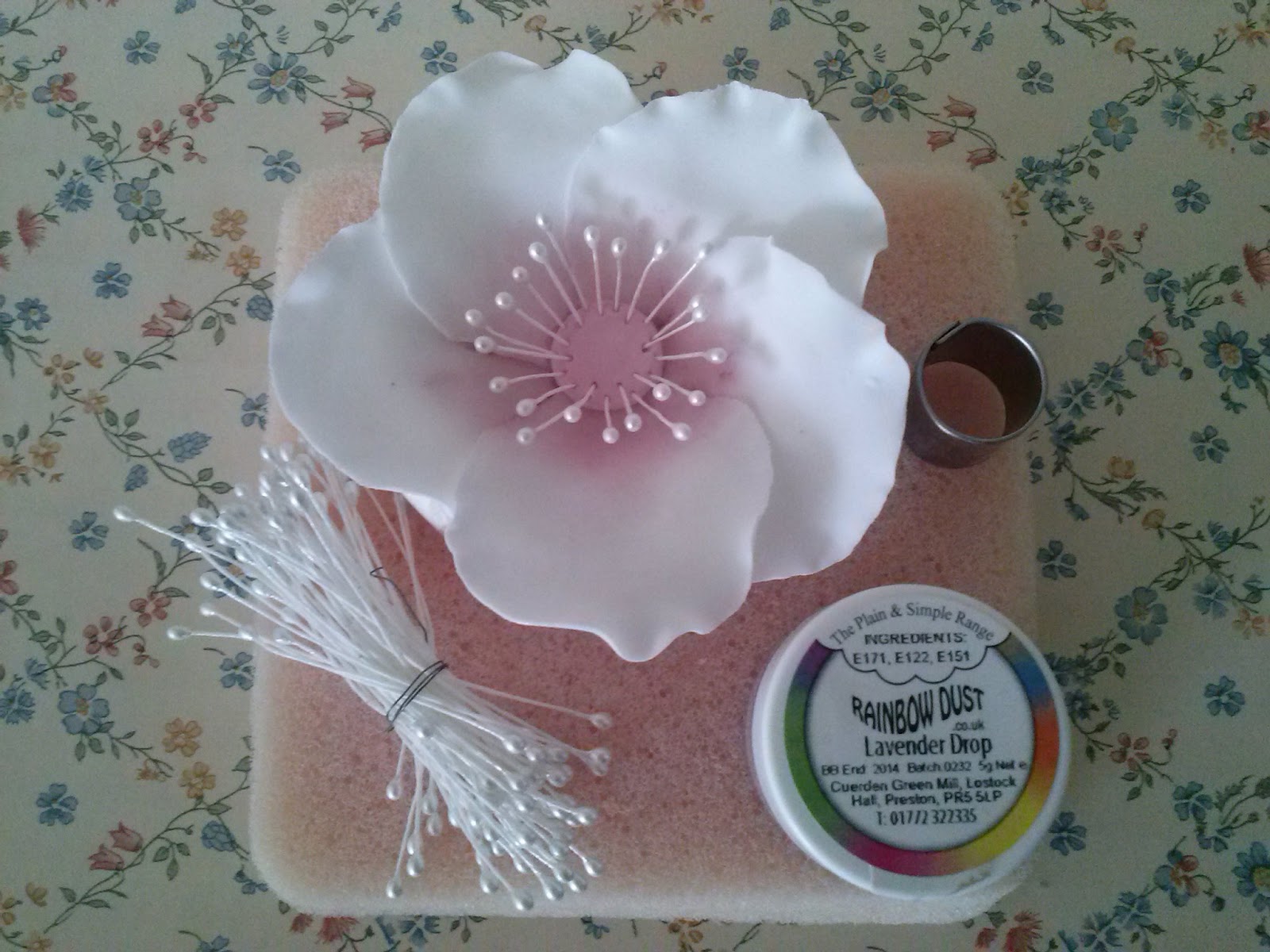 Sin retirarla del aro de papel, he pegado un círculo de pasta de flores en el centro y después he aplicado sobre él y sobre el inicio de los pétalos polvo mate lavanda de Rainbow.