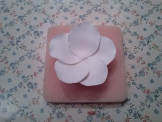 Pegamos cada pétalo por el centro de manera que el que añadimos queda superpuesto al anterior.
