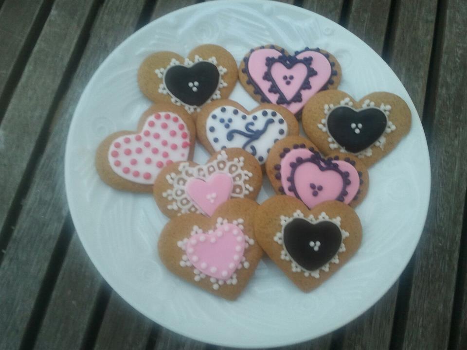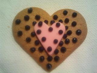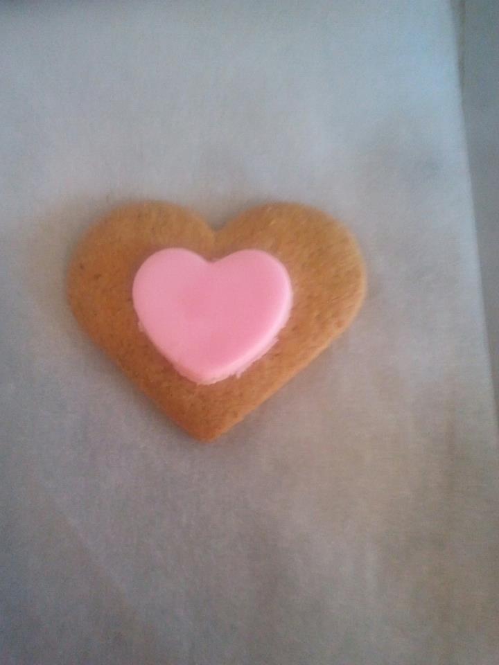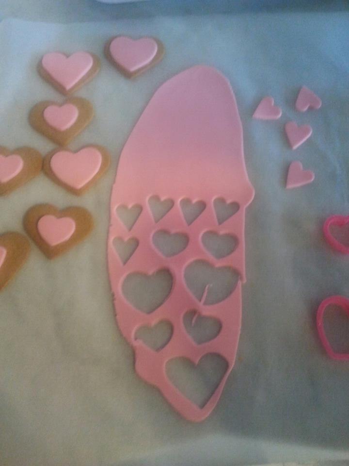 Seguimos cortando corazones, de distintos tamaños si queremos, y pegándolos a las galletas. Así, hasta tener una buena cantidad para decorar.
