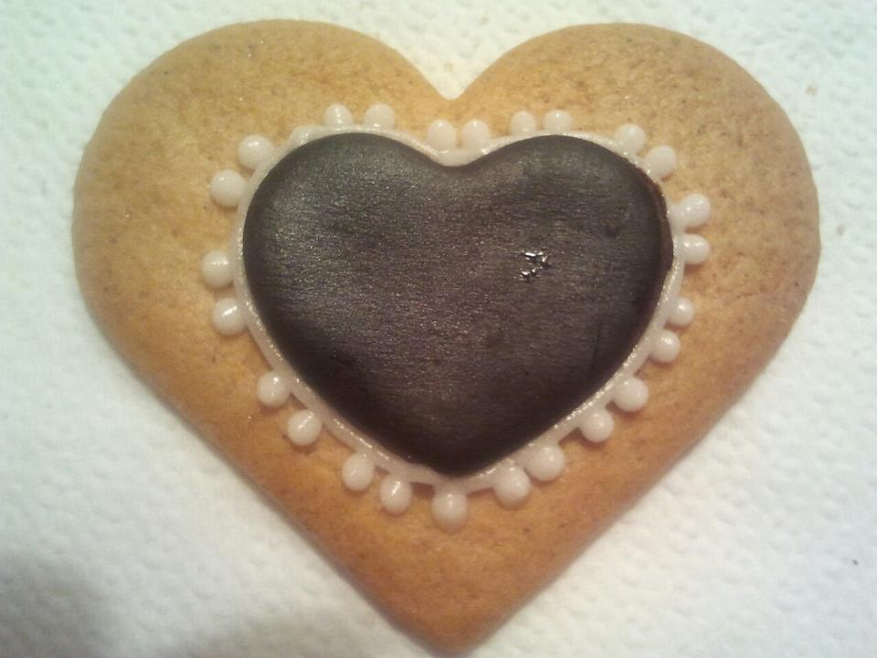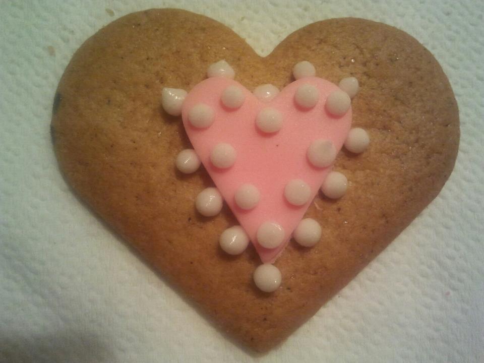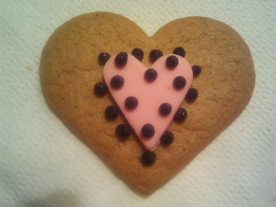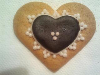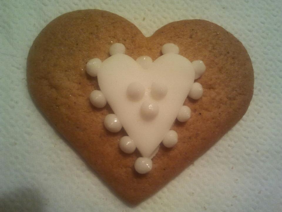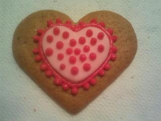 Ponemos un puntito de glasa encima de cada dos puntitos de la primera vuelta. Y tres puntitos en el centro del corazón. Ya está terminada.
