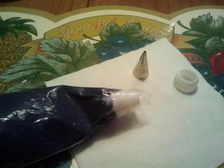 Cogemos una galleta y la colocamos sobre una servilleta de papel. Cogemos una manga con glasa blanca y boquilla del número 1 (también vale del número 2). Cuanto más pequeña es la boquilla, más finita sale la glasa.