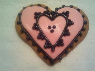Bordeamos ese corazón dibujado con una glasa que contraste (aquí con boquilla del número 2). Bordeamos también el corazón de fuera y ponemos puntitos equidistantes. En el corazón interior repetimos el procedimiento de la galleta anterior, de dos puntitos, espacio, dos puntitos y, en la segunda vuelta, el tercer puntito.