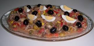 Se sirve con relieves de pepinillos escabechados, alternando con aceitunas en torno a los bordes de la fuente y ramitas de perejil sobre la superficie.