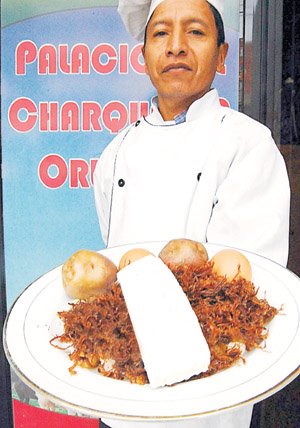 “Se prepara una olla con agua hirviendo. Luego se toman los charques de carne de vaca, se asan en las brasas y conforme se van asando se ponen en la olla con agua, sin separarla del fuego hasta que los charques hayan hervido un poco. Entonces se separan y se amortajan en un mortero a batán, que así salen muy blandos y de mejor gusto. Se les quita los nervios y todos sus tegumentos. Redispone un ahogado lleno contada especial en bastante manteca y un real o más de ají colorado bien molido. Estando ya en punto, se le pone el charque agregándole un poco de caldo y unas papas enteras y cocidas. Se sirve con huevos duros rajados en cuatro y perejil picado por encima. Algunos le añaden arvejas verdes y cocidas. Otros disponen el ahogado con ají amarillo. De cualquier modo es agradable”.