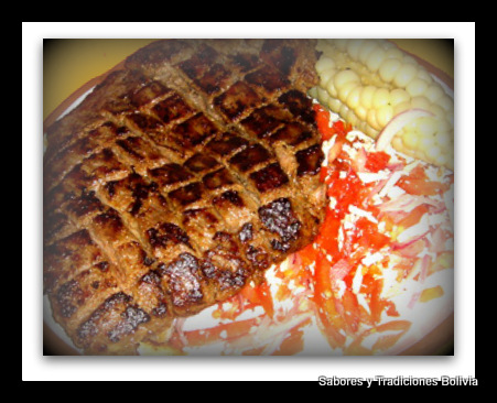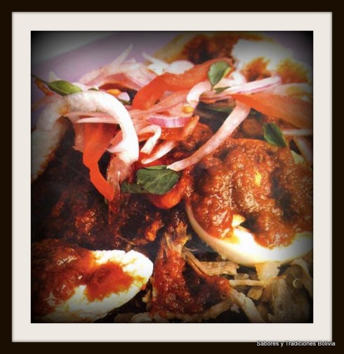 – La salsa principal es la «llajua», un preparado molido en batán (mortero de piedra) de rocoto, que es el ají colorado mas sabroso, tomate y hucatay, todo debidamente sazonado.
