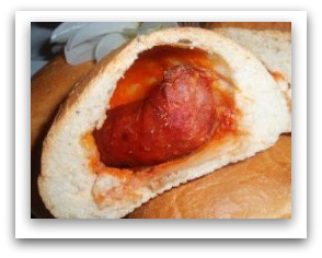 7. Pasado el tiempo para que la masa suba, coge porciones de ella formando una bola, hazles un agujero en el medio con el dedo, e introduce el chorizo cocido en sidra y pinchado.Puedes hacerlo con la puntita de un cuchillo mismo, o con los dientes de un tenedor, eso hará que el chorizo suelte todo su jugo dentro de la masa.
