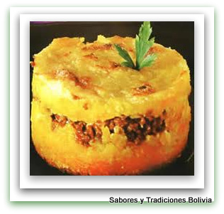 Se hacen cocer papas sin mondar. Después se limpian y se muelen, haciendo con ellas una masa. Se les añaden cuatro huevos batidos, mantequilla y sal: todo en la medida necesaria a la cantidad. Se revuelve bien. Si la masa está suelta, se le echa a poquitos, harina hasta que vaya tomando la suficiente consistencia. Al mismo tiempo, se pone a cocer en mantequilla condimentada con especias, cebolla, tomate, perejil y carne cocida, muy bien picado todo. Se le añaden almendras, pasas de uva, maní tostado y molido, y huevos duros en rebanadas. Se revuelve sin cesar, y cuando la cebolla esté cocida, la confección está a punto y se le retira del fuego.