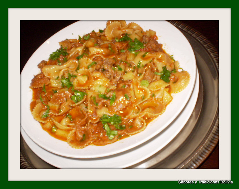 Si el agua se consume antes de que los fideos esten cocidos se le agrega mas sazonando con sal y pimienta a gusto. Cocinar a fuego mediano, hasta que las papas y el fideo estén tiernos, deberá quedar medio jugoso, espolvorear con el perejil picado y servir… y a disfrutar de esta delicia